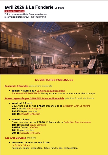 Les Ateliers Généraux habitent régulièrement La Fonderie, pour y mener un travail sur le temps long, de recherche et de création, et y initier d’autres mouvements, avec et en direction des publics. Ils sont constitués par le Collectif « Encore Heureux… », la troupe Les Volontiers, l’Ensemble Offrandes et la plateforme SIWA.